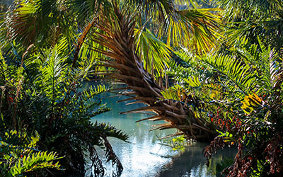A spring fed by an artesian well maintains a steady temperature of 70 degrees year-round, creating a tranquil oasis. Palms and ferns line the water’s edge, with oak and pine trees in the background...