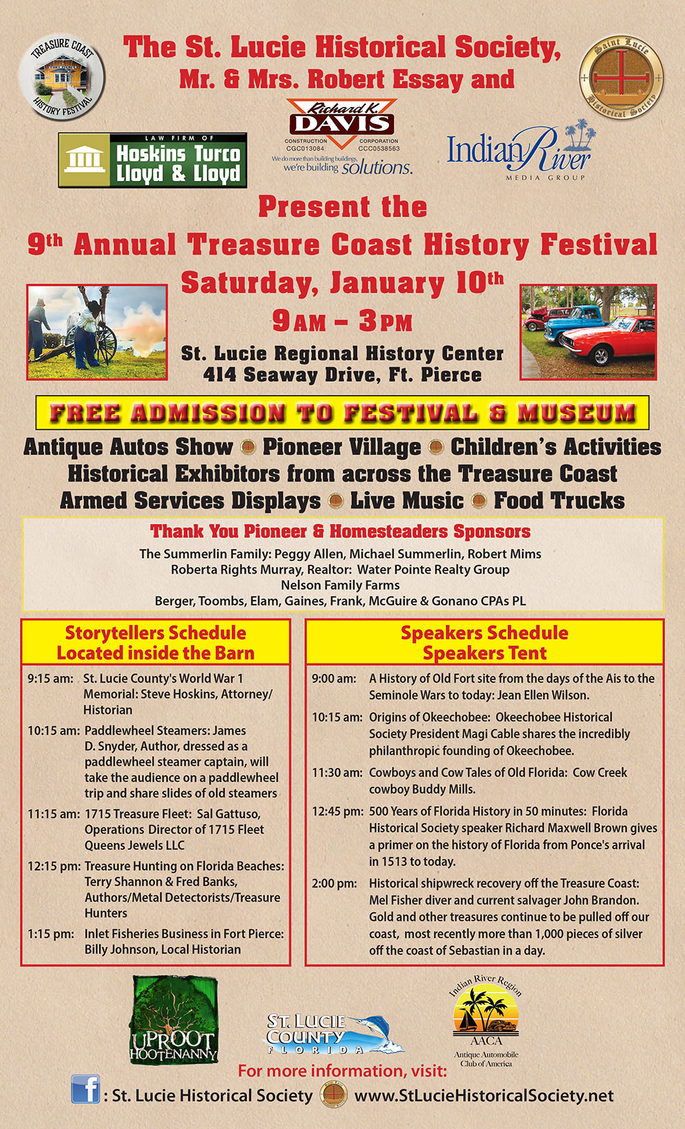 I hope you’ll join us from 9 a.m. to 3 p.m. Saturday, Jan. 10, for the ninth annual Treasure Coast History Festival at the St. Lucie County Regional History Center, 414 Seaway Drive, Fort Pierce.