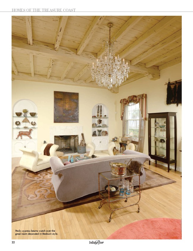 HOMES OF THE TREASURE COAST 22 Pecky cypress beams watch over the great room decorated in Bedouin style.