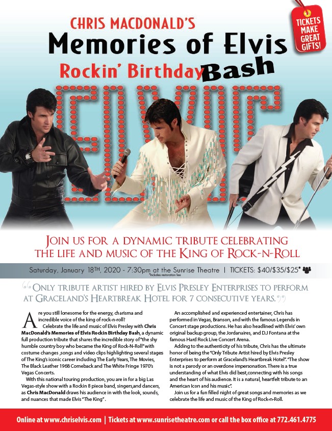 Online at www.chriselvis.com  |  Tickets at www.sunrisetheatre.com or call the box office at 772.461.4775