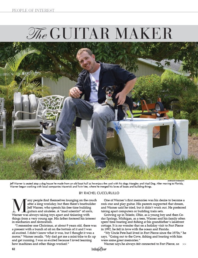 Jeff Warner is seated atop a dog house he made from an old boat hull as he enjoys the yard with his dogs Moogley and Mad Dog. After moving to Florida,