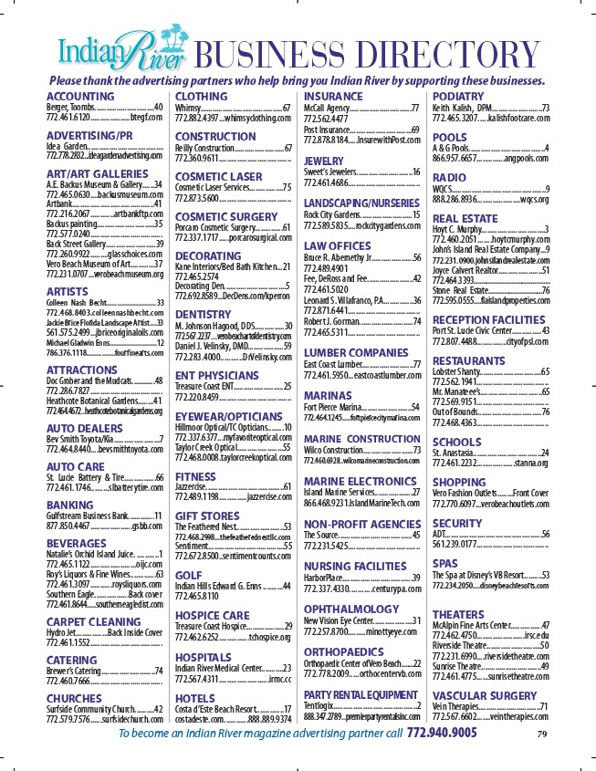 To become an Indian River magazine advertising partner call 772.940.9005 79