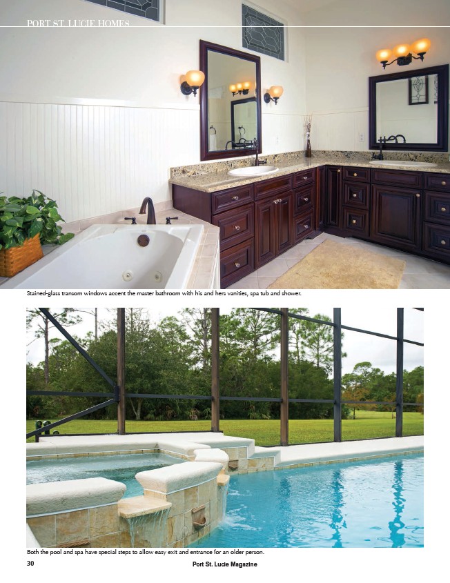 PORT ST. LUCIE HOMES Stained-glass transom windows accent the master bathroom with his and hers vanities, spa tub and shower. Both the pool and spa have special steps to allow easy exit and entrance for an older person. 30 Port St. Lucie Magazine