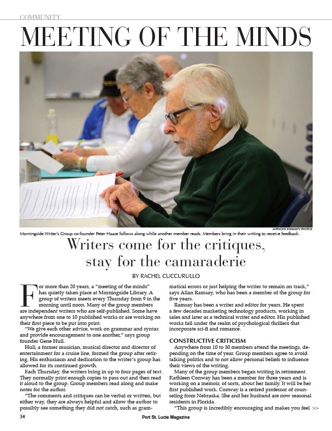 Morningside Writer’s Group co-founder Peter Haase follows along while another member reads. Members bring in their writing to receive feedback.