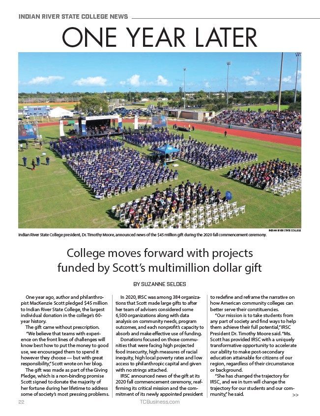 Indian River State College president, Dr. Timothy Moore, announced news of the $45 million gift during the 2020 fall commencement ceremony.