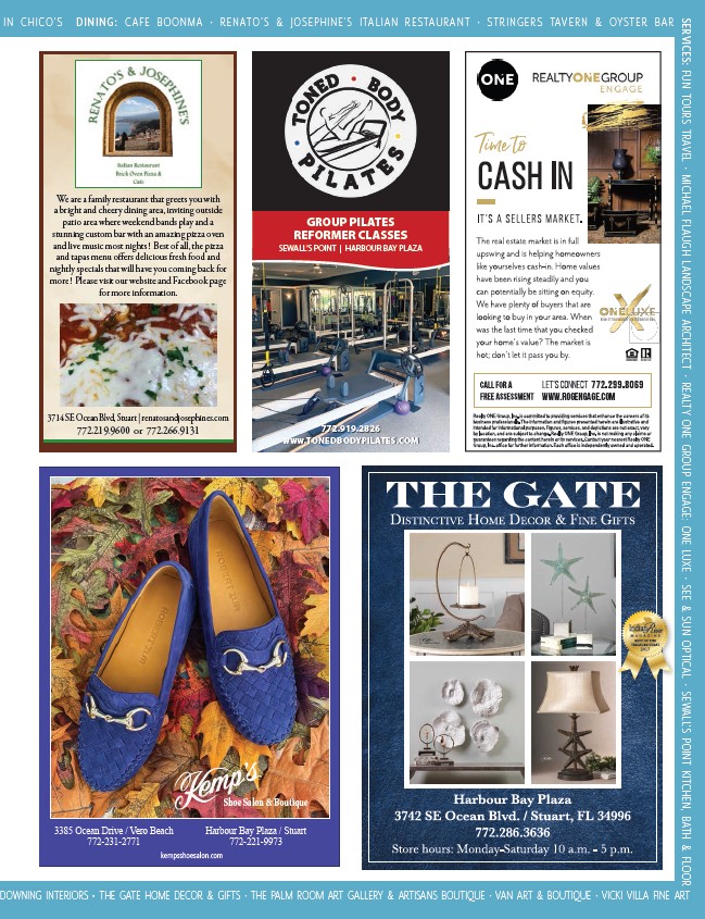 SERVICES: FUN TOURS TRAVEL • MICHAEL FLAUGH LANDSCAPE ARCHITECT • REALTY ONE GROUP ENGAGE: ONE LUXE • SEE & SUN OPTICAL • SEWALL’S POINT KITCHEN, BATH & FLOOR