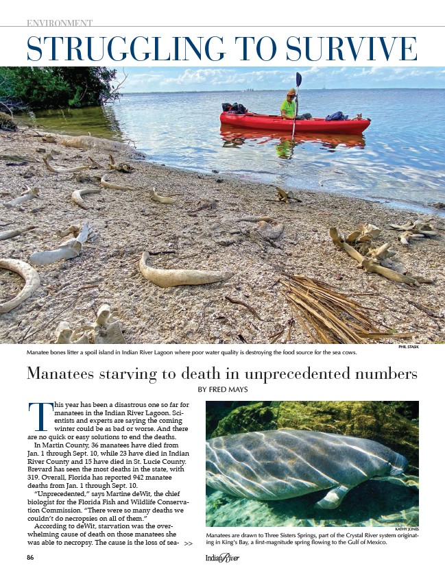 Manatee bones litter a spoil island in Indian River Lagoon where poor water quality is destroying the food source for the sea cows.