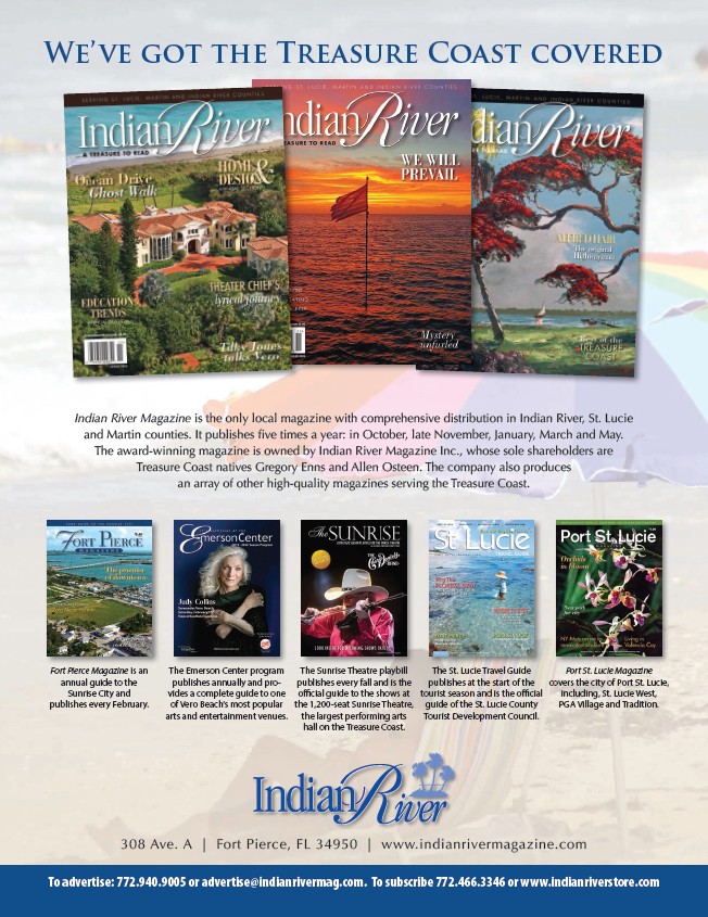 To advertise: 772.940.9005 or advertise@indianrivermag.com. To subscribe 772.466.3346 or www.indianriverstore.com
