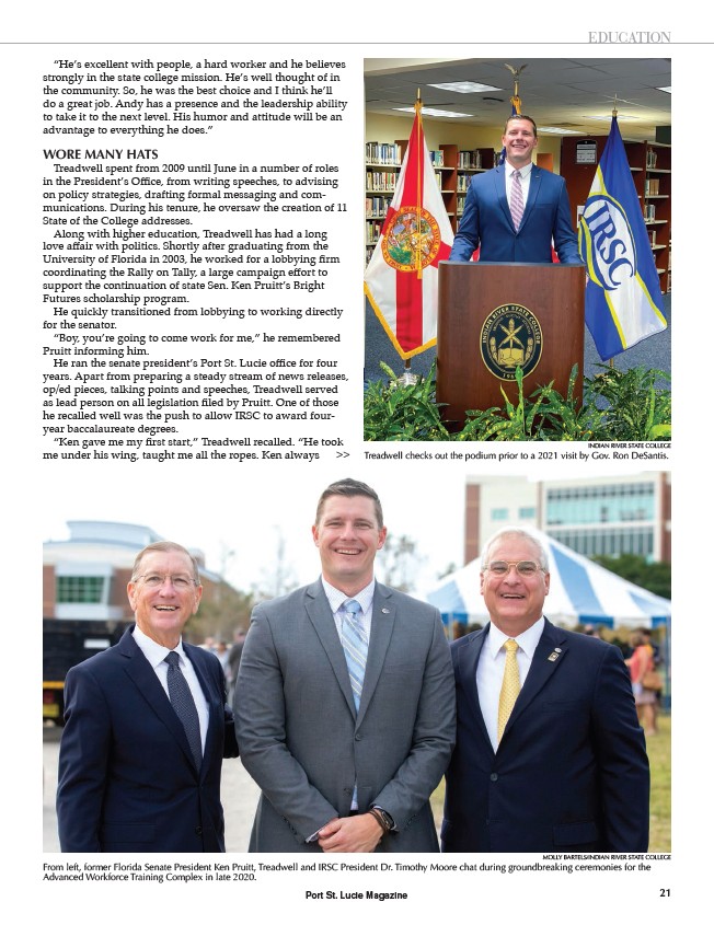 From left, former Florida Senate President Ken Pruitt, Treadwell and IRSC President Dr. Timothy Moore chat during groundbreaking ceremonies for the