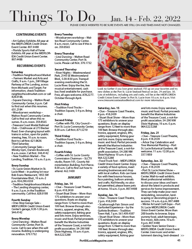 PLEASE CHECK WEBSITES TO BE SURE EVENTS ARE STILL ON AND TIMES HAVE NOT CHANGED.