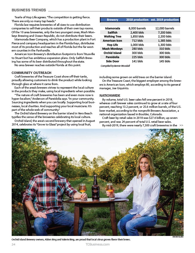 Orchid Island Brewery owners, Alden Bing and Valerie Bing, are proud that local citrus groves flavor their brews.