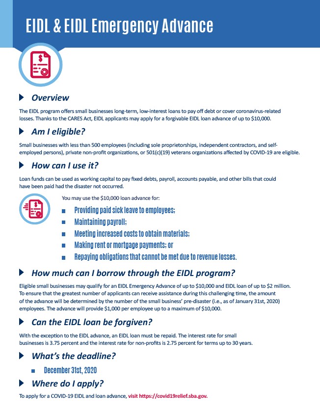Eligible small businesses may qualify for an EIDL Emergency Advance of up to $10,000 and EIDL loan of up to $2 million.