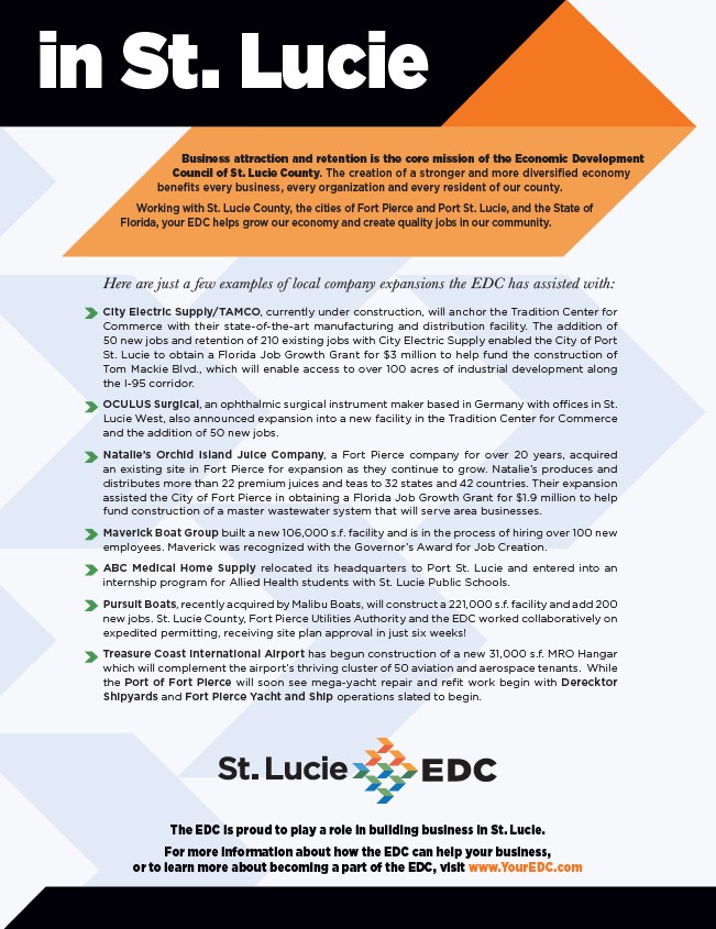 new jobs. St. Lucie County, Fort Pierce Utilities Authority and the EDC worked collaboratively on