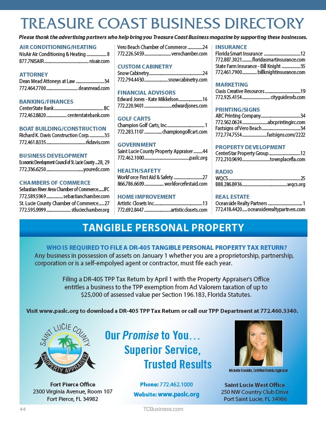 Please thank the advertising partners who help bring you Treasure Coast Business magazine by supporting these businesses.
